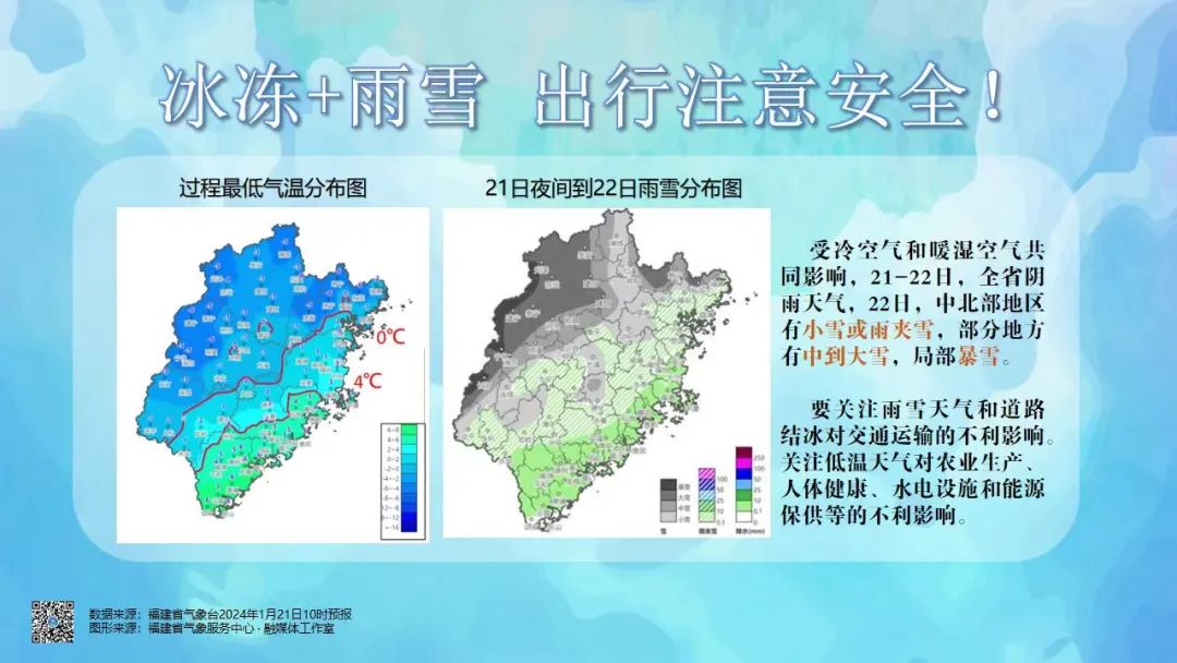 今天夜间,中北部地区有小雨。南平(浦城、光泽、武夷山、邵武)、三明(建宁、泰宁)和宁德(寿宁、周宁、柘荣)有雨夹雪或小雪。22日,中北部地区有小雪或雨夹雪,南平大部、三明(建宁、泰宁、宁化、清流、明溪、将乐、沙县)、宁德(寿宁、周宁、柘荣、福鼎、屏南)、龙岩(长汀、连城、武平)和泉州(德化)有中到大雪,局部暴雪,其余地区大部有小雨。23日,全省阴到多云,白天西部地区局部有雨夹雪或小雪。