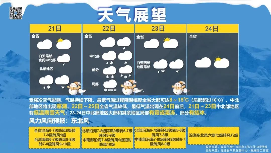 省气象台于1月19日10时发布“低温预警Ⅳ级”,据气象预报,21日夜间到23日,全省将有300个以上乡镇气温达到0℃以下并出现降水。根据《福建省低温天气应急预案》,省减灾委决定于2024年1月21日12时启动低温天气Ⅳ级应急响应。请各设区市和平潭综合实验区减灾委、省减灾委相关成员单位密切关注低温雨雪冰冻灾害情况,做好各项防范应对准备,细化安排部署防御工作。